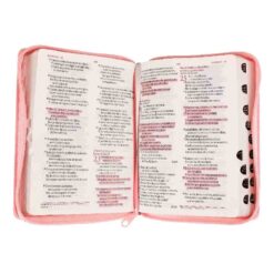 Biblia Reina Valera 1960 Edición Fuente de Bendiciones “Quinceañera”, con tamaño compacto, letra 8 puntos, pasta en imitación piel color rosa claro con cierre, canto plateado y cinta marcadora.
