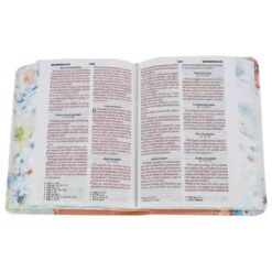 Biblia RVR1960 con palabras de Jesús en rojo, letra mediana de 8 puntos, tipografía clara, notas a pie de página, referencias cruzadas a pie de página, concordancia de 120 páginas y diseño bicolor (blanco y coral) con flores.