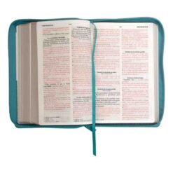 Reina Valera 1960, tamaño manual (138×212 mm), imitación piel bitono, canto dorado, con cierre, palabras de Jesús en rojo, concordancia, Concordancia de personajes bíblicos, ayudas, referencias cruzadas, 32 páginas a todo color con ayudas y esquemas, 12 mapas a todo color, Letra 12 puntos.
