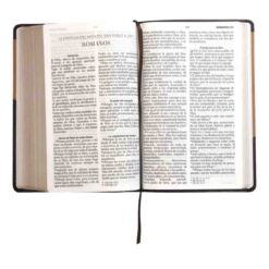 Reina Valera 1960, tamaño manual (138×212 mm), imitación piel bitono, canto dorado, palabras de Jesús en rojo, concordancia , Concordancia de personajes bíblicos. Ayudas, referencias cruzadas. 32 páginas a todo color con ayudas y esquemas. 12 mapas a todo color .Letra 12 puntos.