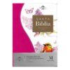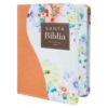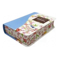 Biblia RVR1960 con palabras de Jesús en rojo, letra mediana de 8 puntos, tipografía clara, notas a pie de página, referencias cruzadas a pie de página, concordancia de 120 páginas y diseño bicolor (blanco y azul) con flores.